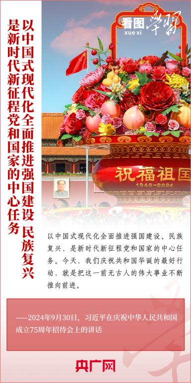 “经过75年的艰苦奋斗,中国式现代化已经展开壮美画卷并呈现出无比光明灿烂的前景。”9月30日,庆祝中华人民共和国成立75周年招待会在京举行。习近平总书记出席招待会并发表重要讲话。总书记强调,以中国式现代化全面推进强国建设、民族复兴,是新时代新征程党和国家的中心任务。我们庆祝共和国华诞的最好行动,就是把这一前无古人的伟大事业不断推向前进。在举国上下欢庆国庆之际,一起来学习!