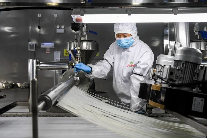 在广西柳州市一家螺蛳粉生产企业,工作人员在查看米粉的生产情况(2024年12月13日摄)。新华社记者 曹祎铭 摄