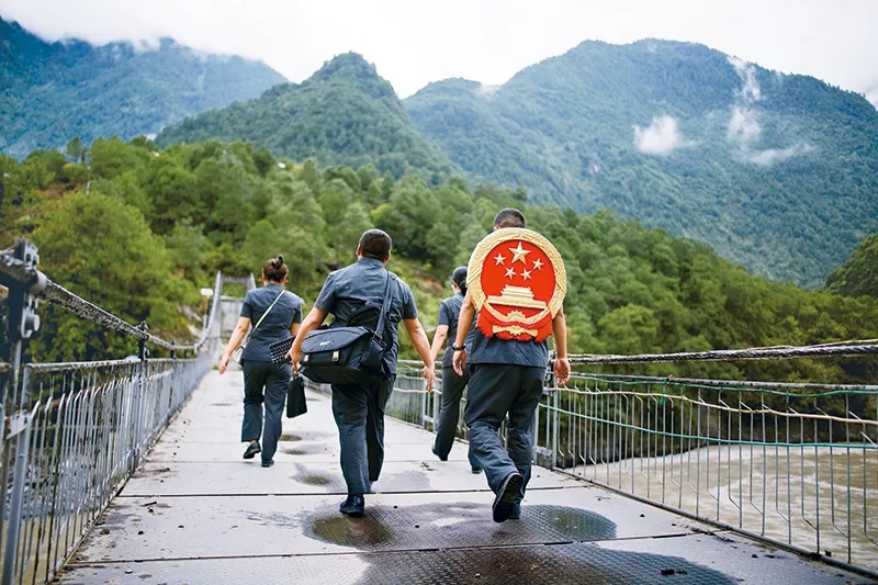 云南省怒江傈僳族自治州98%以上的面积是高山峡谷,交通不便,法官们经常背着国徽攀高山、过索桥、躲落石、钻老林,为群众进行法律服务。图为贡山县人民法院法官邓兴背着国徽与同事们跨过怒江(2019年8月30日摄)。 新华社记者 江文耀/摄