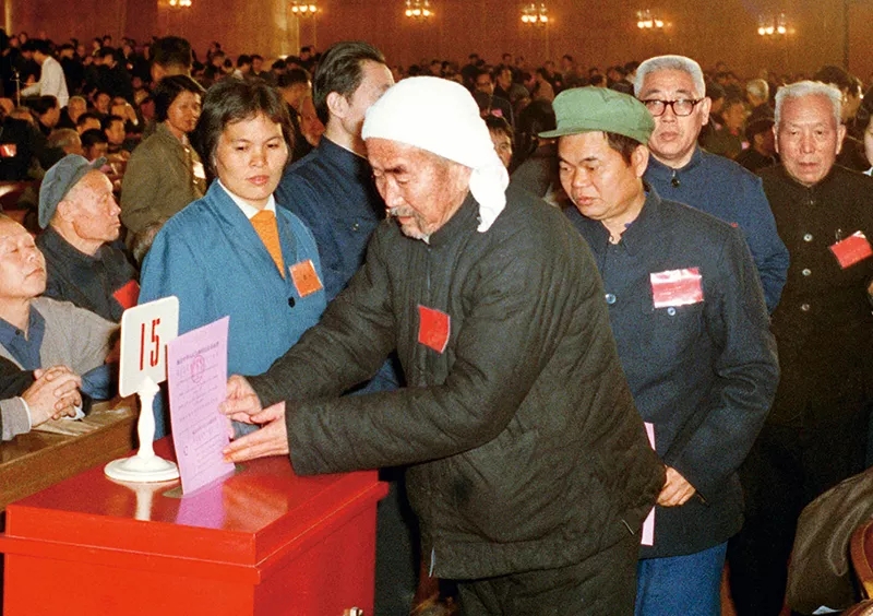图为出席第五届全国人民代表大会第五次会议的代表投票表决《中华人民共和国宪法》。 新华社发(资料照片)