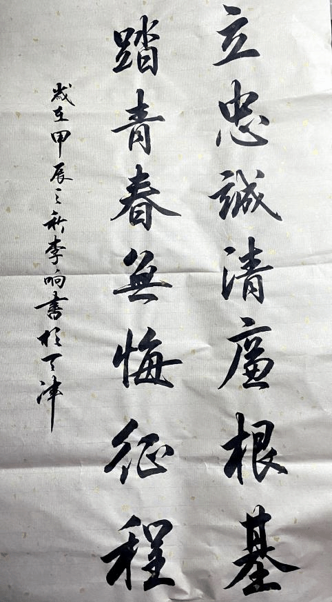 行书“立忠诚清廉根基,踏青春无悔征程”,笔势灵动不失稳重。“忠诚清廉” 显廉洁信念,“青春无悔” 传使命担当,既具书法流畅美,又颂廉洁品格、赞青春奋进,激励人筑牢根基赴征程。