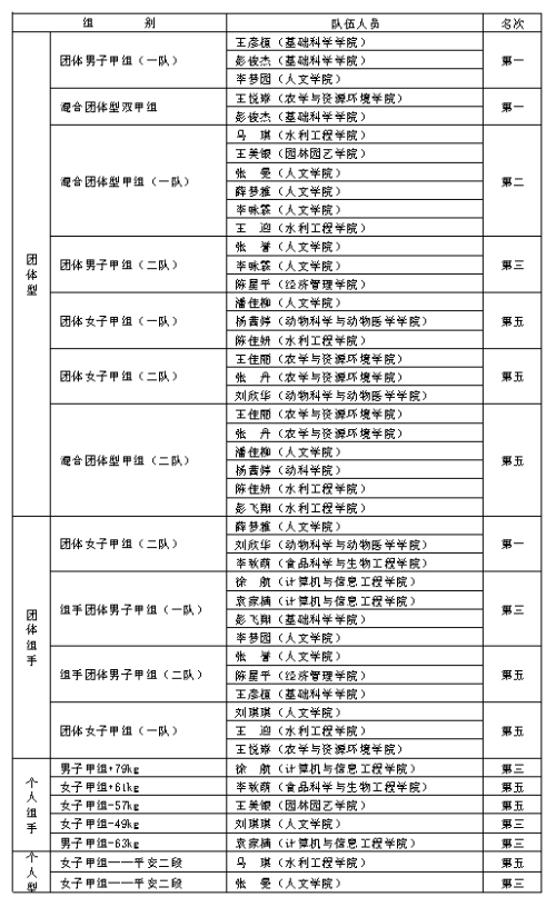 在本次大赛中,由基础科学学院王彦植与彭俊杰、人文学院李梦园组成的男子团体型一队,在比赛场中势如破竹以显著优势勇得金牌;彭俊杰和农学与资源环境学院的王悦琳组成的混双团体型在赛场上表现极佳,比分遥遥领先,两人的精彩配合博得了全场最热烈的掌声;由人文学院薛梦雅、动物科学与动物医学学院刘欣华、食品科学与生物工程学院李秋萌组成的团体女子组手一路过关斩将,为学校再添一金。