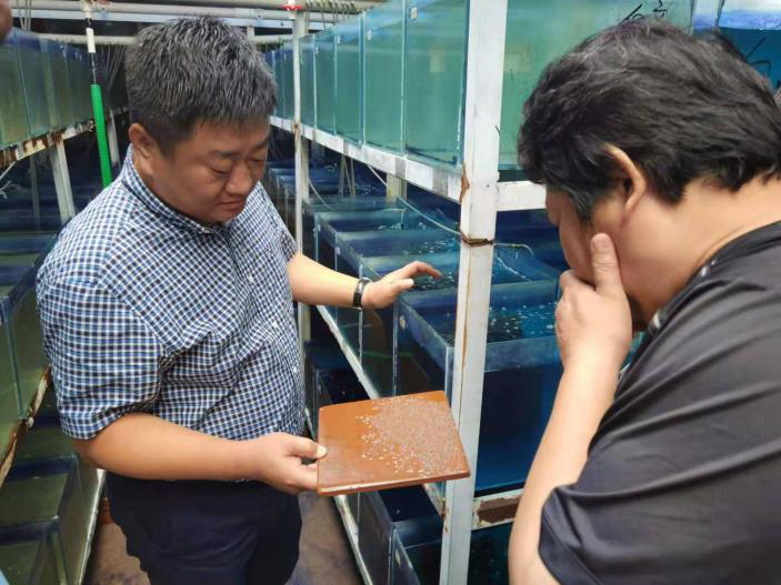 随后,专家组一行到天津农垦渤海农业集团有限公司下属公司天津嘉禾田源观赏鱼养殖有限公司,现场察看大口黑鲈和鹦鹉鱼繁育与养殖情况。公司经理刘文军介绍了大口黑鲈和鹦鹉鱼繁养情况,对前期出现的繁养问题与陈成勋进行了交流,同时表示陈成勋给予的解决方案切实可行、效果显著,解决了鱼苗大批死亡的问题。