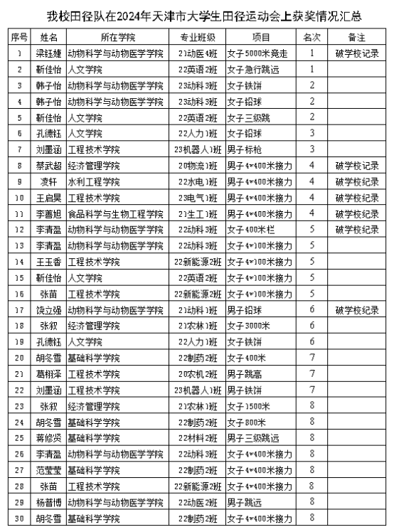 动物科学与动物医学学院2021级梁钰婕同学获了女子5000米竞走冠军、并打破由她自己保持的女子5000米竞走校记录;2023级的韩子怡同学获得女子铅球和女子铁饼比赛两项亚军;2022级的李清盈同学在女子400米跨栏项目中,以1分23秒89的成绩斩获了大运会第五名的佳绩,打破了尘封长达38年之久的该项目校纪录,在随后的女子4×100米和女子4×400米接力赛中,与队友们紧密配合,获得了4×100米接力第五名和4×400米接力第八名的优异成绩;2021级饶力强同学在男子铅球比赛中,以10.61米的成绩获得大运会比赛第六名并打破了由原田径队王国柱同学2015年创造的校记录。
