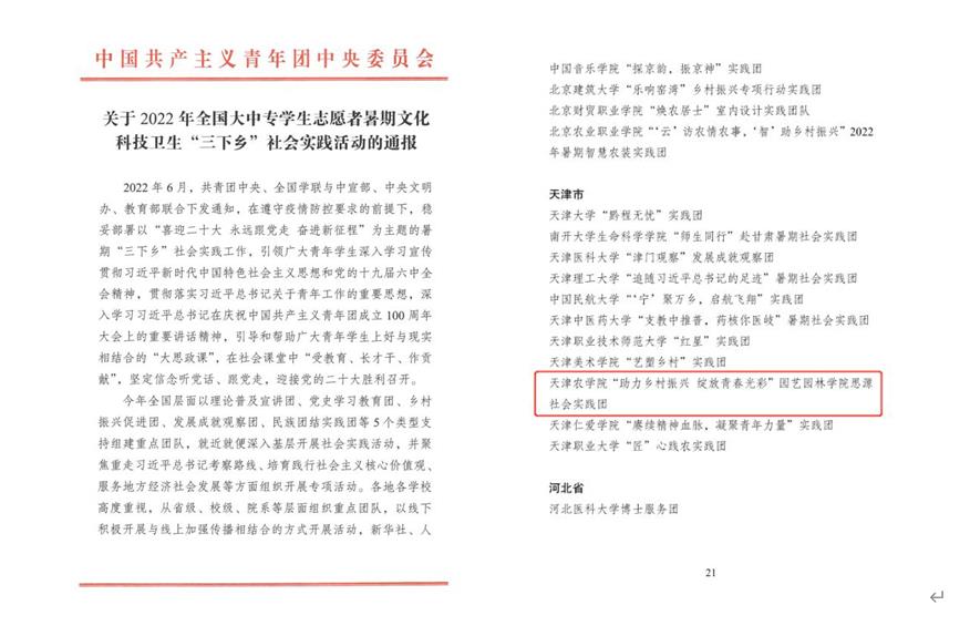 “助力乡村振兴 绽放青春光彩”园艺园林学院思源社会实践团荣获2022年全国“三下乡”社会实践优秀团队