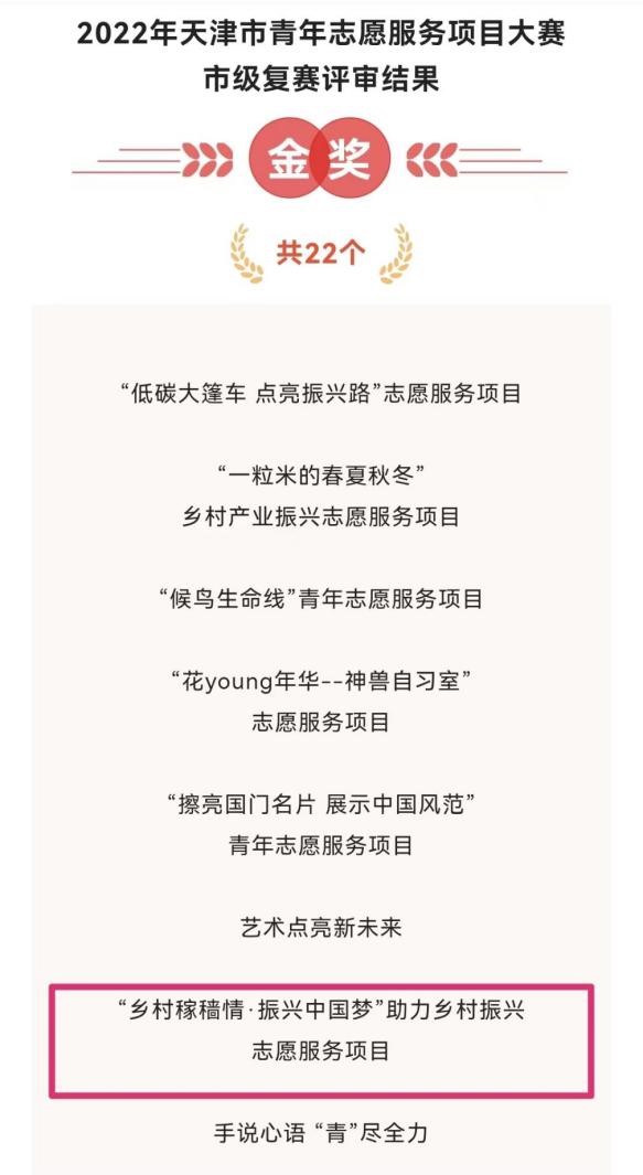 “乡村稼穑情·振兴中国梦”助力乡村振兴志愿服务项目荣获2022年天津市青年志愿服务项目大赛金奖