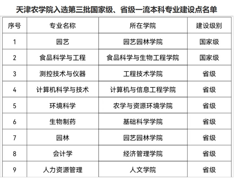 园艺、食品科学与工程2个专业入选国家级一流本科专业建设点,测控技术与仪器等7个专业入选省级一流本科专业建设点。水文与水资源工程专业通过工程教育专业认证。获天津市教学成果一等奖2项、二等奖9项。获批教育部产学合作协同育人项目4项。获批国家级大创项目50项、市级项目98项。获批2个天津市高校服务产业特色学科群。3个“科技小院”获批国家级支持建设。开展书记校长访企拓岗促就业专项行动,为2022届毕业生开拓就业岗位1000余个。