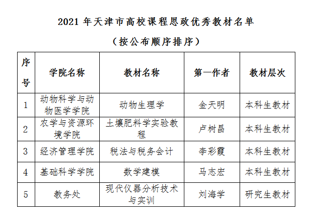 近日,天津市教委下发《市教委关于公布2021年天津市高校课程思政示范课程、教学名师和团队、优秀教材评审结果的通知》,beat3654门本科课程、1门研究生课程、1门继续教育课程、2门高职课程获批天津市课程思政示范课程,4种本科生教材、1种研究生教材获批天津市课程思政优秀教材。根据文件精神,入选2021年天津市课程思政示范课程相应授课教师、团队直接认定为2021年天津市高校课程思政教学名师和教学团队。