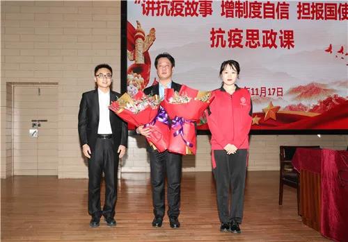 授课结束后,校党员突击队队员代表和beat365优秀抗疫志愿者代表向陆伟献花,以此向以陆伟为代表的抗疫英雄们致敬!
