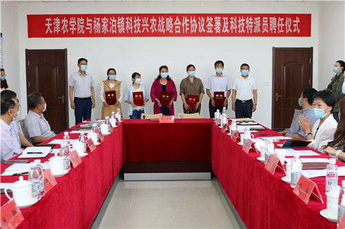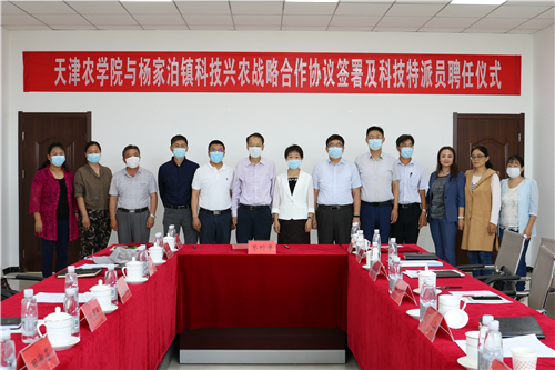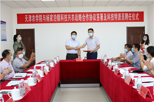 6月2日,乡村振兴研究院与杨家泊镇人民政府科技兴农战略合作协议签署及科技特派员聘任仪式在杨家泊镇文化中心举行。滨海新区区委常委、组织部长张弢,beat365党委副书记、校长王延文和副校长、乡村振兴研究院院长赵辉,杨家泊镇党委书记闫宁和党委副书记、镇长刘向昱出席,仪式由杨家泊镇党委副书记刘琨主持。