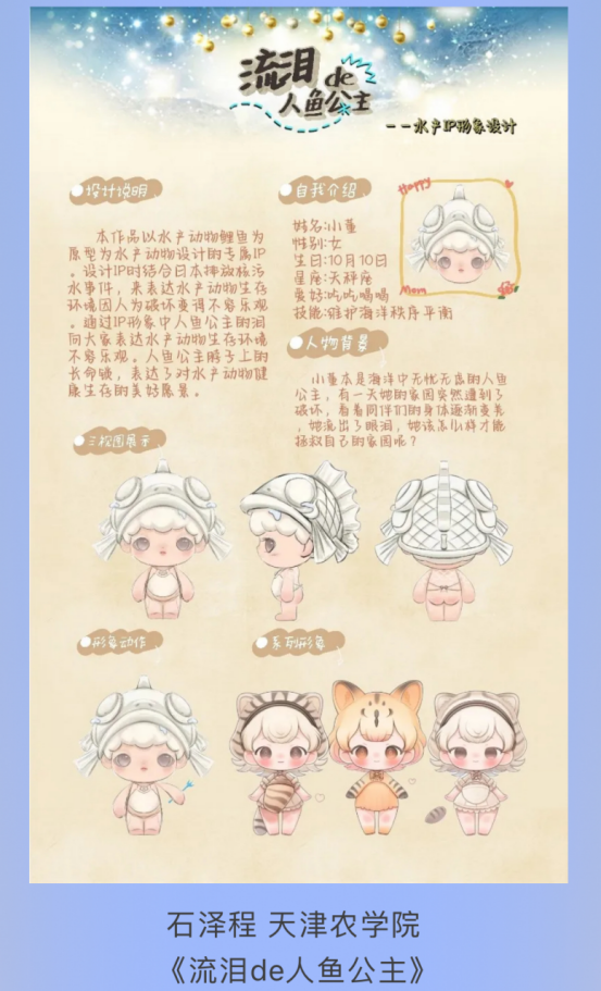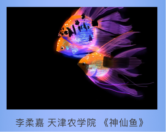 由章晨茜老师指导、2021级水产养殖学2班石泽程同学创作的作品《流泪de人鱼公主》获IP组—等奖及人气奖,由许昍老师指导、2022级水生动物医学1班李柔嘉同学创作的作品《神仙鱼》获手绘组二等奖。