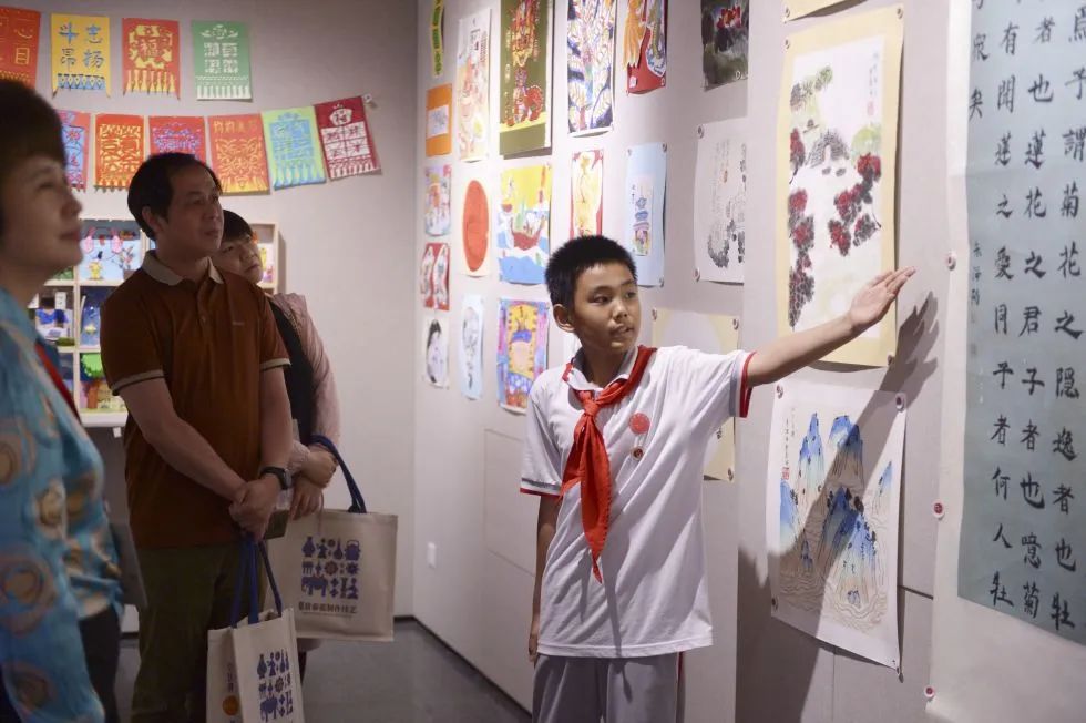 2024年5月17日上午,府学胡同小学的“小小讲解员”在向来宾介绍学生艺术作品展。新华社记者 胥晓璇 摄