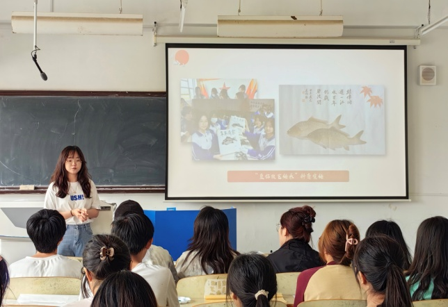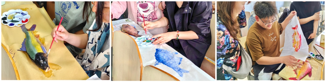 在介绍了“鱼拓”技艺的起源与内涵后,主讲人用现场展示及播放项目组制作的《非遗传承·宋式美学》教学视频的方式对“鱼拓”制作过程进行了讲解,同学们很快便沉浸其中开始创作属于自己的“鱼拓”作品。