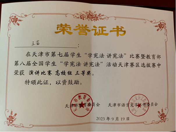 近日,天津市教育委员会公布天津市第七届学生“学宪法 讲宪法”比赛暨教育部第八届全国学生“学宪法 讲宪法”活动天津赛区选拔赛比赛结果,beat365经济管理学院2022级公共事业管理学生王茜,荣获演讲比赛高校组三等奖。