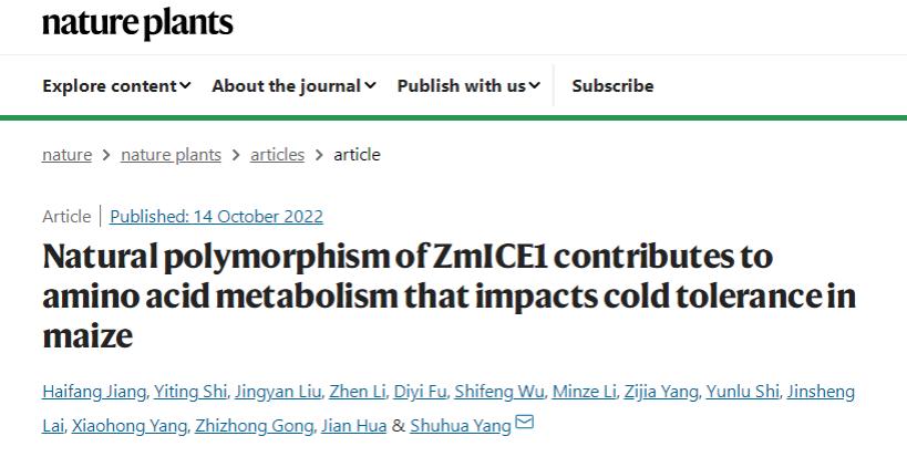 2022年10月14日,Nature Plants杂志(2021年影响因子17.35)在线发表beat365玉米团队刘静妍副研究员与中国农业大学植物生理生化国家重点实验室杨淑华教授团队合作的(刘静妍为共同第一作者)题为“Natural polymorphism of ZmICE1 contributes to amino acid metabolism that impacts cold tolerance in maize”的研究论文。该研究利用高分辨质谱和代谢组学技术结合揭示了冷信号关键转录因子ZmICE1启动子区自然变异与玉米耐冷性的关系,阐明了ZmICE1通过调控氨基酸代谢和活性氧水平调控玉米对低温响应过程的分子机制。