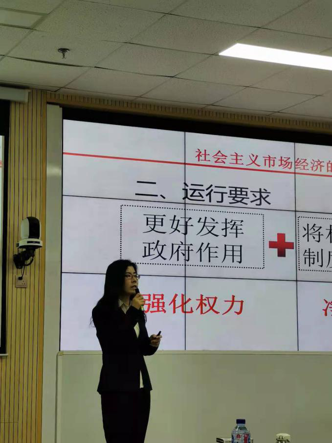 张秀霞从学生对市场经济在两种社会制度下是否有区别的疑惑入手,结合我国在教育领域的成就、脱贫攻坚的举措以及从严治党的制度安排等现实事例及数据,从市场经济的运行机制、运行要求、运行目标等三个方面讲述了社会主义市场经济的运行特点。