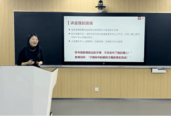 在专家经验分享环节,王静做了《以问题链讲深讲透讲活道理》的主题报告。她从思政课教学之难在何处、思政课教学之难如何破解、问题链教学法如何运用三个维度对主题进行阐释,辅之案例、层层剖析。她强调,讲深道理需直击核心问题,挖掘问题、运用问题链教学法是关键,尤其要凝练并聚焦大问题、真问题。
