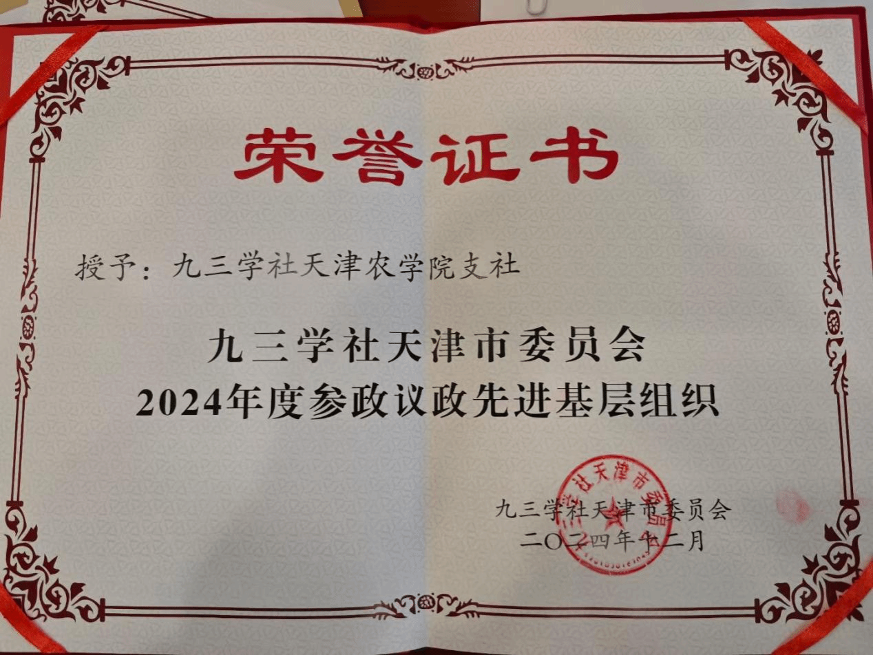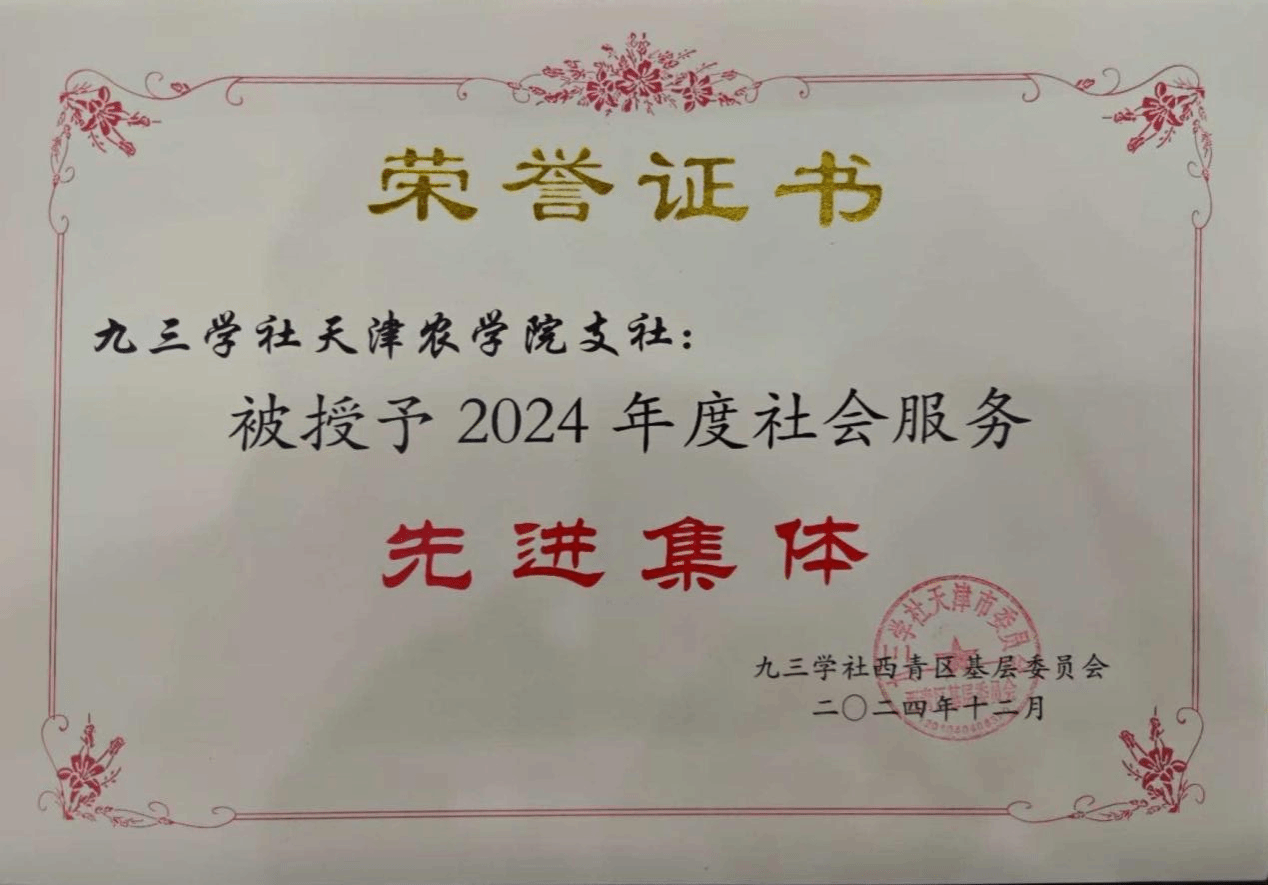 九三学社beat365手机版官网支社获得九三学社天津市委员会2024年度参政议政先进基层组织、九三学社西青区基层委员会社会服务先进集体。