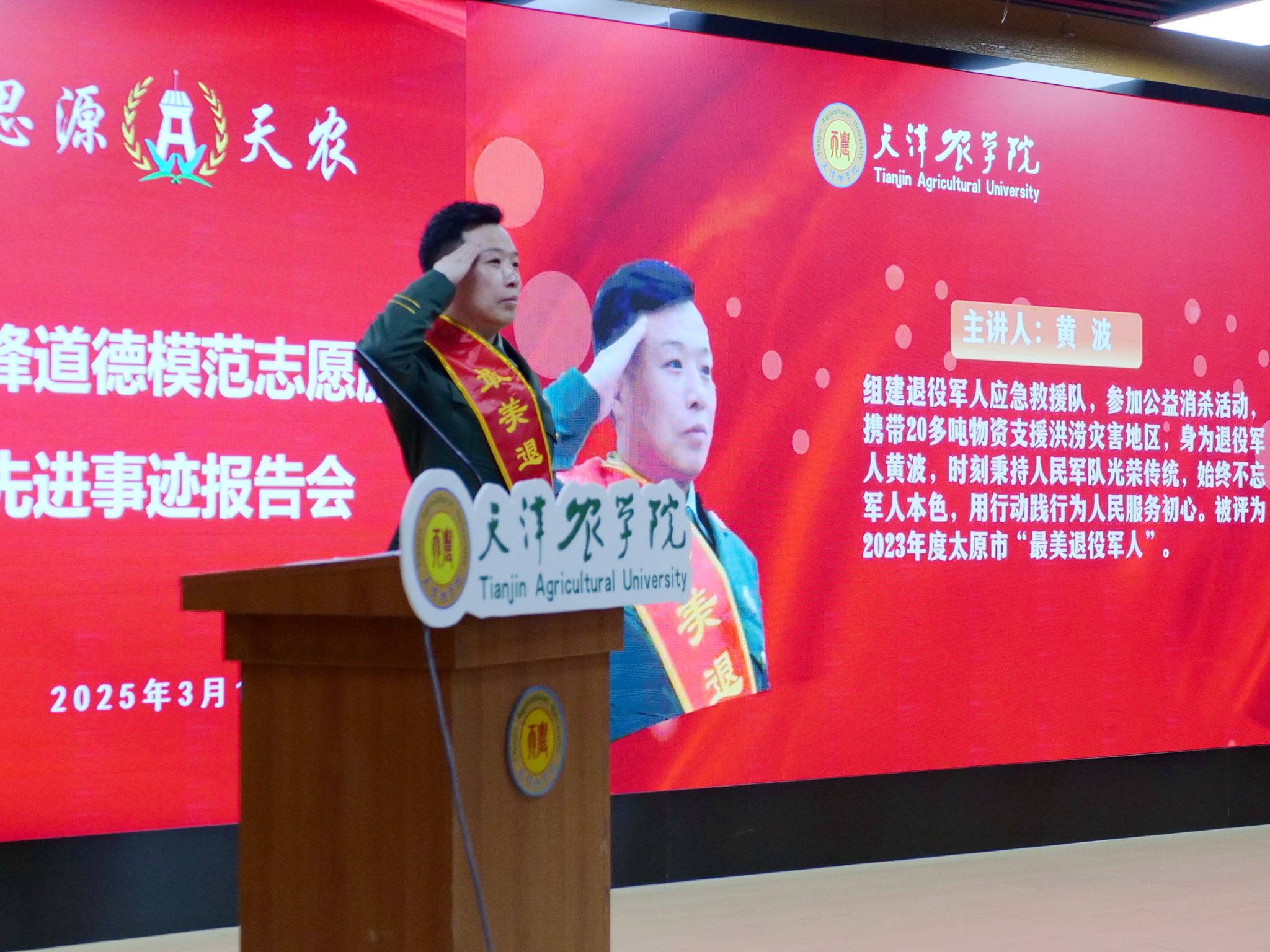 山西省太原市最美退伍军人黄波同志以《学习雷锋永前行,扶贫帮困献爱心》为题作报告,讲述了自己退伍后成立志愿服务队的经历,身份虽变,但他坚守初心,退役不褪色。