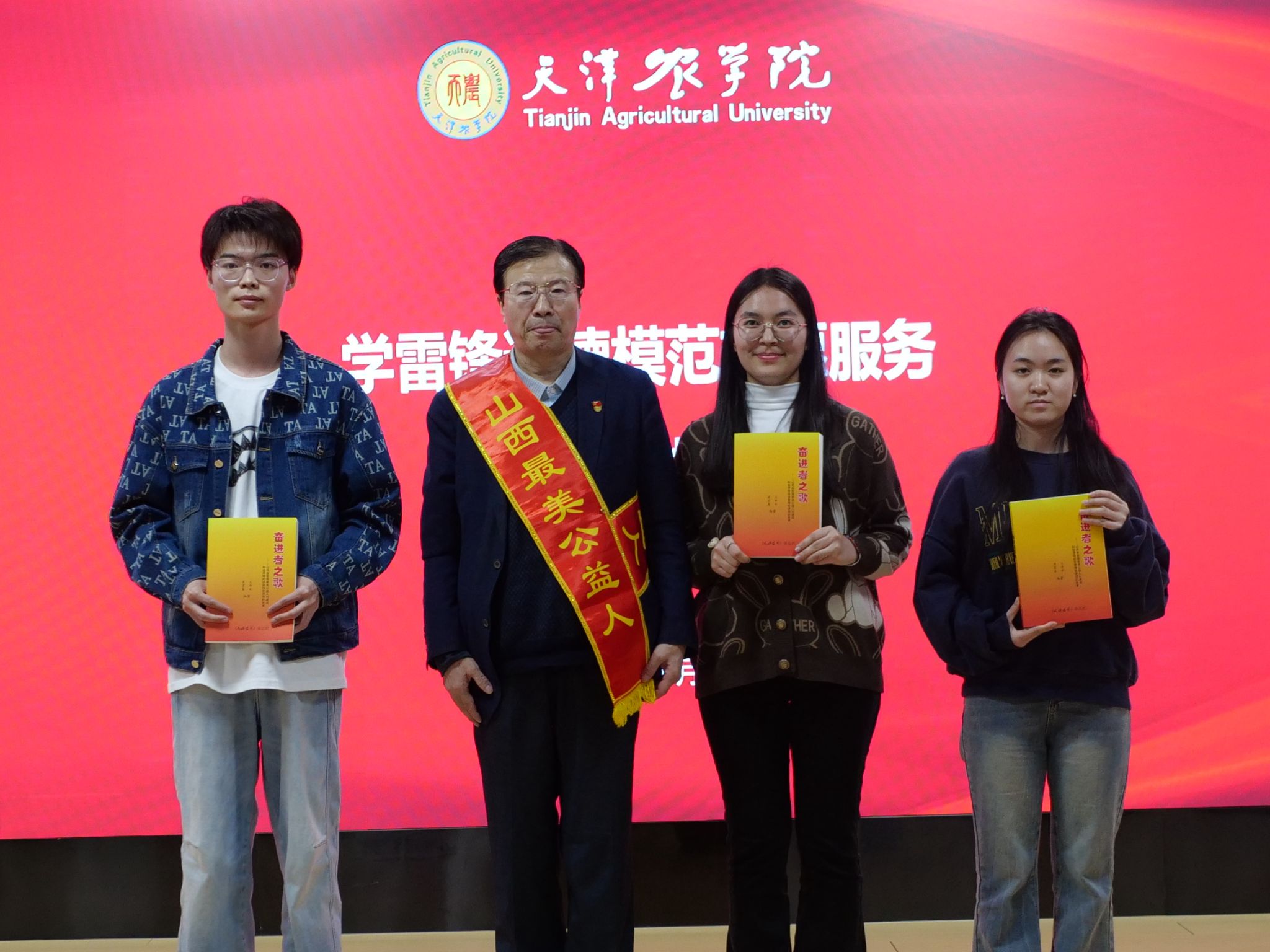 宣讲团为beat365青年志愿者代表赠送书籍《奋进者之歌——山西省首届最美公益人刘建成和他带领的学雷锋巡讲团的故事》。