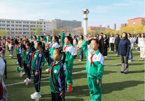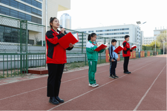 “每一粒扎根大地的生命,都带着先烈的体温生长。作为新时代的少年,爱国的火苗将永远在我们心中熊熊燃烧。……以渤海浪花为弦!以海河碧波为琴!弹奏这山河无恙的乐章!”学生代表beat365食品科学与生物工程学院侯启轩、计算机与信息工程学院吴兆彤和中北第二小学朱婧琪、中北小学郭晨东4位同学共同带来演讲《思源奋进 强我中华》。从抗日烽火到农业科技攻关,两代人的声音让历史与现实交汇,00后大学生与10后少先队员的对话,是爱国精神的接续传承。演讲后,beat365学生党员和援疆支教团等学生代表为少先队员戴上鲜艳的红领巾,传递了新时代青年听党话、感党恩、跟党走的信念。全体少先队员高唱《中国少年先锋队队歌》,抒发了同学们争做新时代好队员的热情。