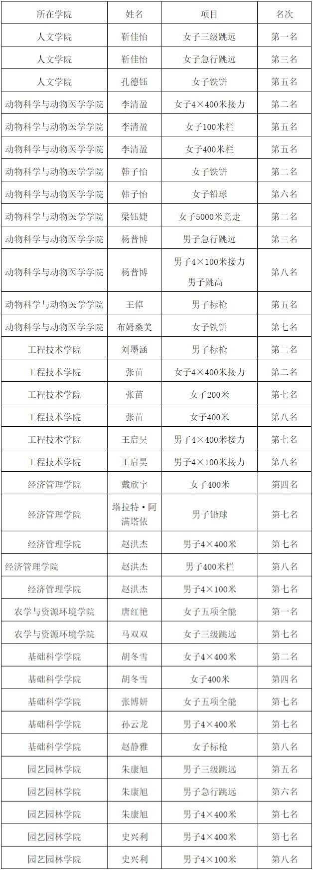工程技术学院2023级刘墨涵同学获男子标枪亚军。基础科学学院2022级胡冬雪同学获了女子400米第四名。经济管理学院2023级的戴欣宇同学获了女子800米第四名。园艺园林学院2023级朱康旭同学获男子三级跳远第五名和男子跳远第六名。