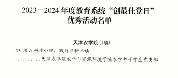 参与大中小学思政教育一体化建设。党支部积极助力大中小学思想政治教育一体化建设,致力打造党建共同体和劳动思政教学共同体,建立了“党建+思政”“党建+劳育”“党建+实践”育人模式。打造了《伟大的中国梦》《人生三部曲》《大米的前世今生》《种艺画制作》等主题思政课程,联合西青区实验小学开展了“田间劳动践初心,党建引领育新人”主题党日活动暨思政课实践教学,以党建引领促发展,使师生在劳动实践中践行初心使命,彰显忠诚担当。