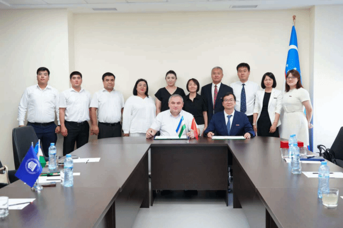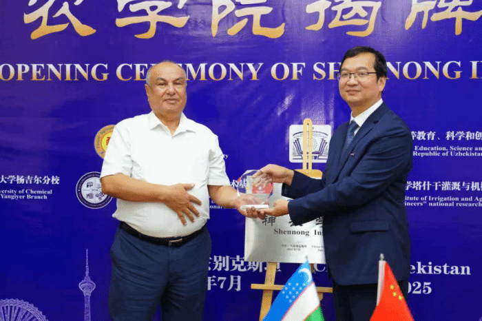 7月13日至16日,beat365党委副书记、校长金危危率团访问乌兹别克斯坦,参加beat365与乌兹别克斯坦各高校合作共建“神农学院”揭牌仪式。与教育部高等职业教育机构材料和技术基础中心主任赫迪罗夫、塔什干化工大学杨吉尔分校校长卡基莫夫、塔什干建筑与土木工程大学副校长尼格马德亚诺娃亲切会谈,并与乌兹合作高校校方领导共同为“神农学院”揭牌。