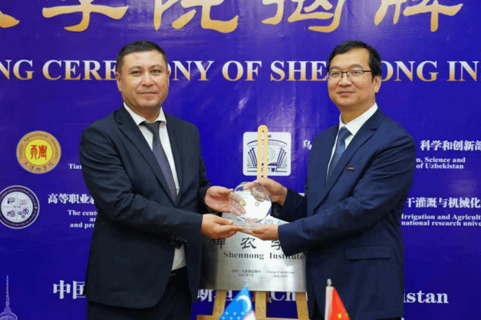 金危危在致辞中指出,借此次揭牌仪式的契机,我们将与各位乌兹合作伙伴一道,共同推进“神农学院”招生及品牌建设。乌兹别克斯坦合作高校、科研机构以“神农学院”的品牌项目在当地进行招生,学生可以通过“2+2”或“3+1”项目及短期学习的形式来津学习。中乌合作方将在园艺、水产、环境设计、水文与水资源工程等专业联合开展本科层次的合作办学。我们将在乌兹别克斯坦和中国政府的关怀和领导下,以此次携手为新的起点,依托优良的办学条件、先进的办学理念,尽快创出形象、创出品牌,共同将“神农学院”打造成两国合作办学的示范和标杆,打造成在两国农业教育领域具有一定影响力的农业教育机构。正如乌兹别克斯坦谚语“友谊的土壤里,总会长出甜蜜的果实”,这些合作正孕育着丰饶的未来。相信“神农学院”的项目不仅可以提高我们共同的办学水平,增强合作高校在农业领域教育的竞争力,促进相关产业增收与经济发展,同时可以加快促进双方现代农业教育体系和科研体系的发展。