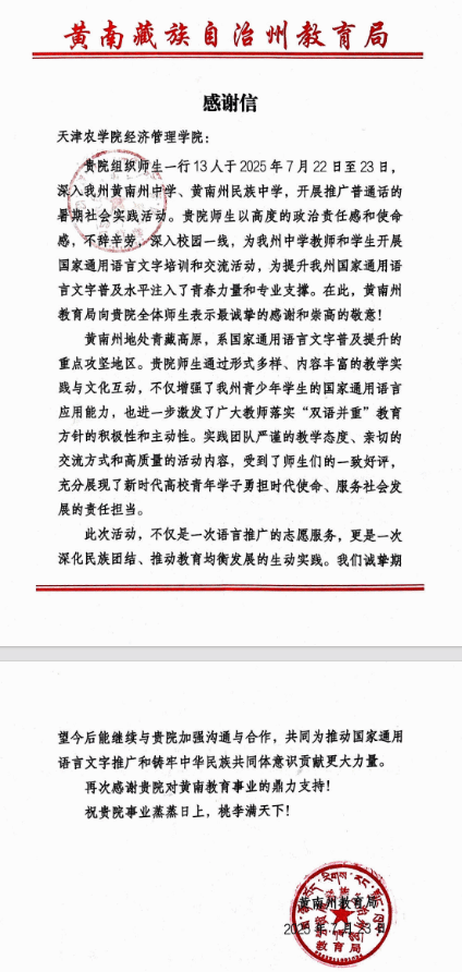 活动结束后,黄南州教育局、黄乃亥日秀玛村村民委员会和保安镇人民政府纷纷向实践团发来感谢信。此次收到的感谢信中提到,实践团的到来为当地的普通话推广工作注入了新的活力,有效提高了当地居民和学生的普通话水平,促进了当地的文化交流和发展。信中还特别赞扬了实践团成员们严谨认真的工作态度、吃苦耐劳的精神品质和扎实的专业素养。