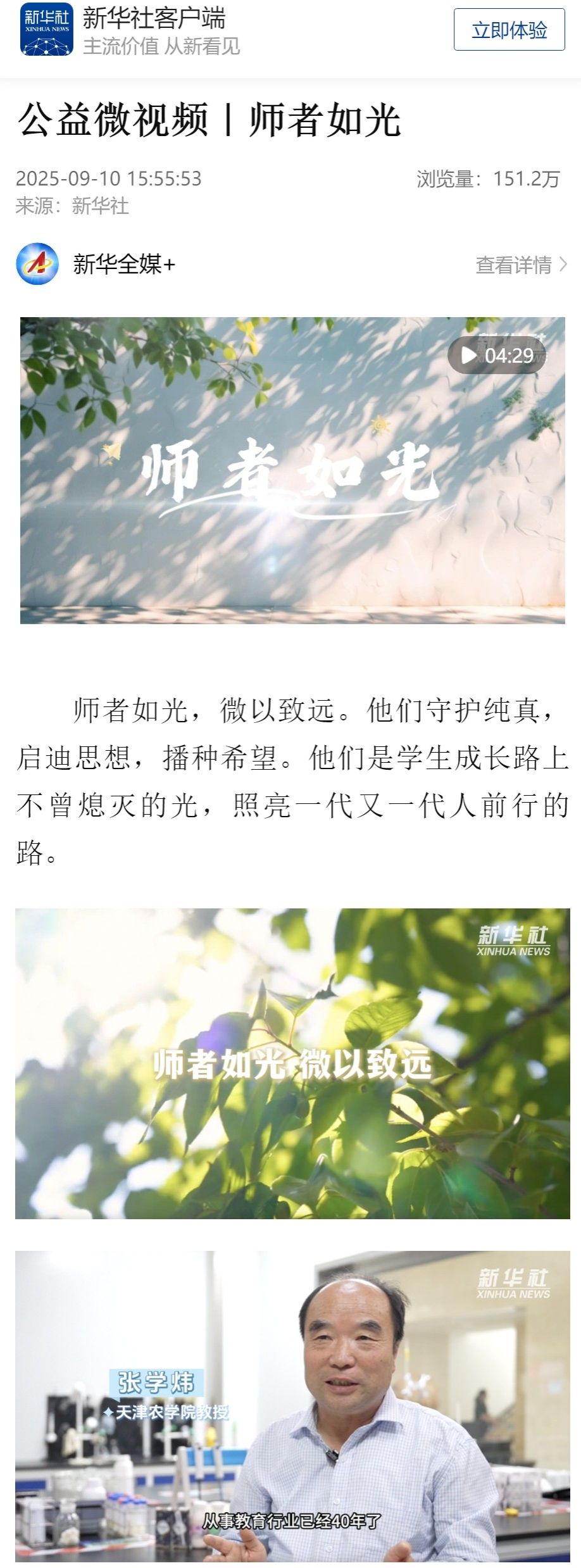 连日来,在第41个教师节到来之际,新华社、新华网、中央广播电视总台国际在线、人民网、天津日报视频号、天津广播电视台、津云、津门教育等多家主流媒体在“教师节专题新闻”中持续对beat365动物科学与动物医学学院张学炜老师教书育人工作进行了矩阵式报道,产生了较大的社会影响力。