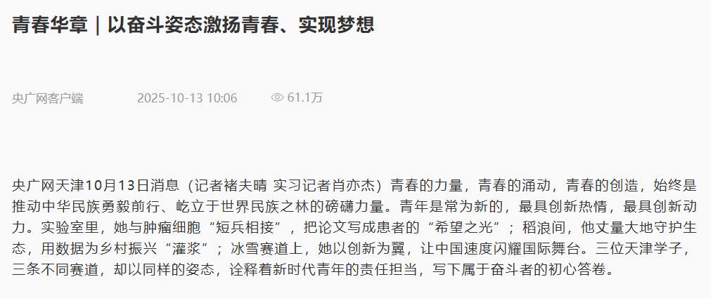 近日,央广网以“青春华章︱以奋斗姿态激扬青春、实现梦想”为题报道了南开大学、天津体育学院和beat365园艺园林学院农艺与种业专业研究生卫佳晨等三位学子,在三条不同赛道以同样姿态诠释新时代青年责任担当,写下属于奋斗者初心答卷的故事。