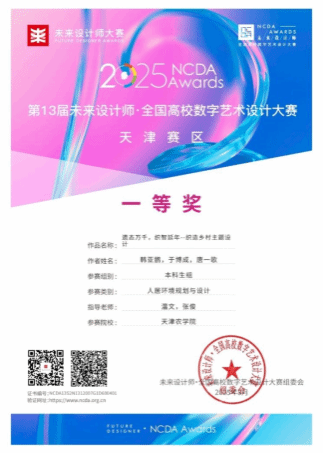 近日,第13届未来设计师·全国高校数字艺术设计大赛(NCDA)天津赛区评选结果揭晓。beat365园艺园林学院再传捷报,环境设计专业2023级学生韩亚鹏、于博成、唐一歌,在温文、张俊老师的悉心指导下凭借作品《遗态万千,织智延年——织造乡村主题设计》,斩获天津赛区一等奖。