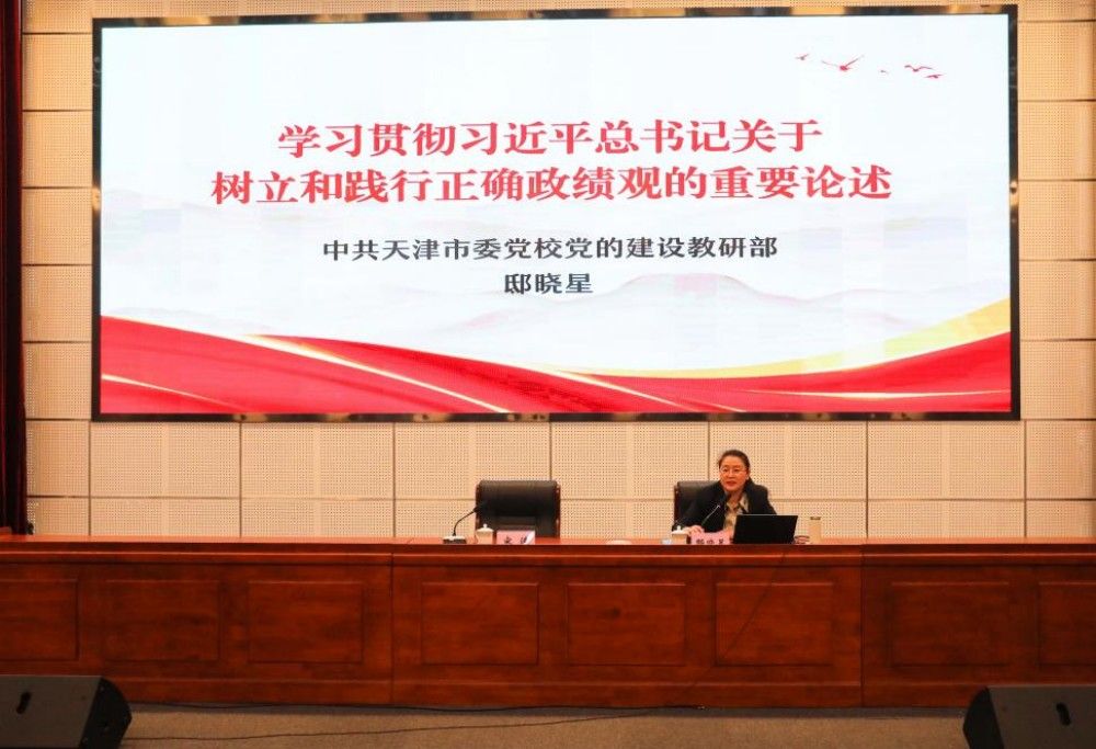 专题辅导环节,天津市委党校党的建设教研部副主任邸晓星教授围绕《习近平总书记关于树立和践行正确政绩观的重要论述》作专题辅导,从正确政绩观的战略意义、核心要义与实践要求、引领保障三个方面,对习近平总书记关于树立和践行正确政绩观的重要论述进行了系统阐释与深入解读。报告条理清晰、重点突出、内容丰富,为全校党员干部深化理论学习、抓好贯彻落实提供了有力指导。