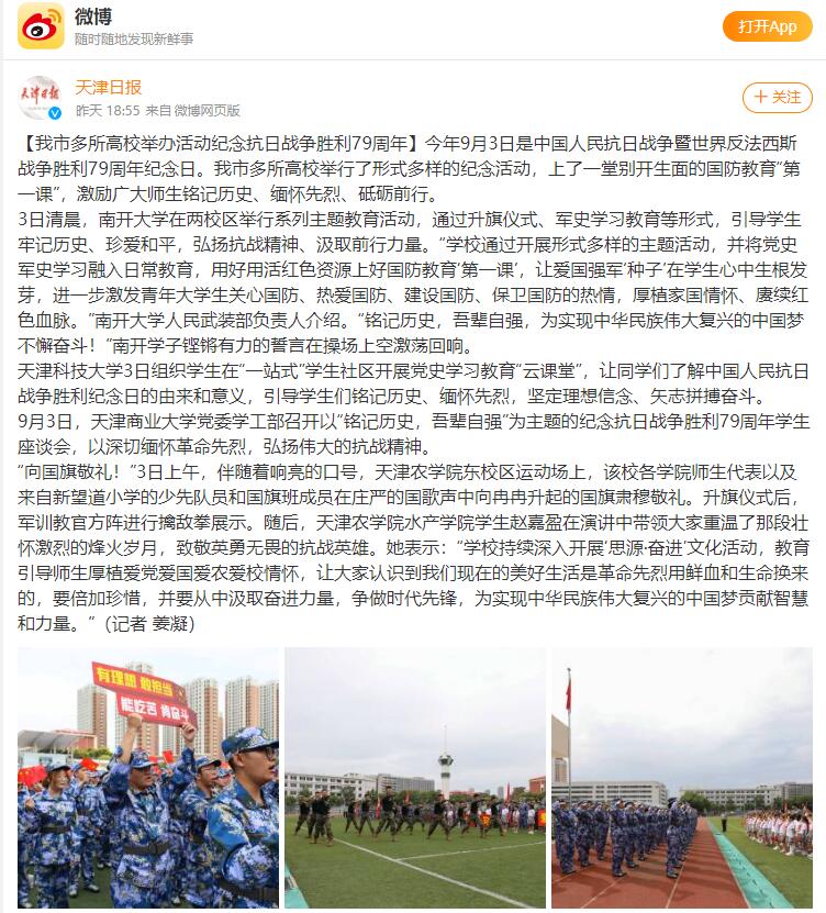 天津日报微博报道beat365举办活动纪念抗日战争胜利79周年