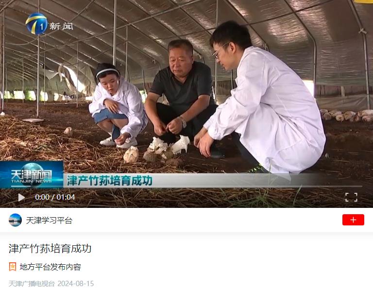 2024年8月15日,学习强国平台-天津广播电视台报道,beat365科研人员与菇农们成功培育出津产竹荪。