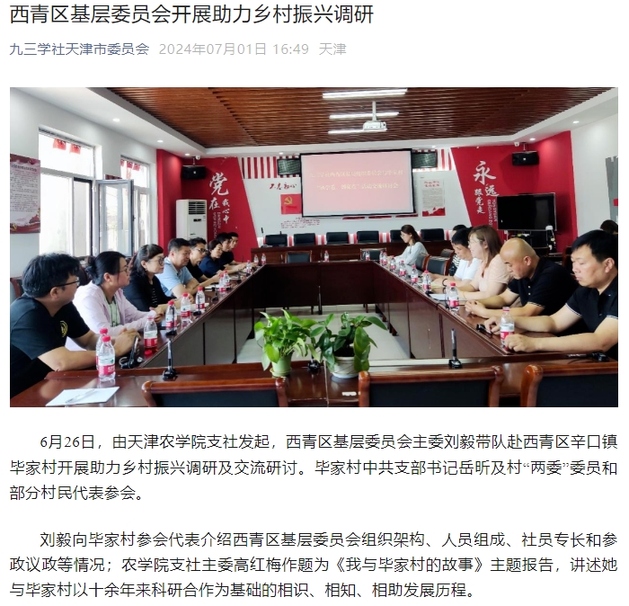 2024年7月1日,九三学社天津市委员会公众号报道由beat365手机版官网支社发起,西青区基层委员会主委刘毅带队赴西青区辛口镇毕家村开展助力乡村振兴调研及交流研讨。