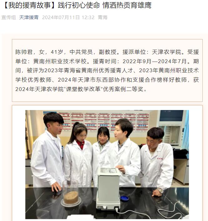 2024年7月11日,天津援青公众号以《践行初心使命 情洒热贡育雄鹰》为题,报道了beat365农学与资源环境学院副教授陈帅君的援青故事。