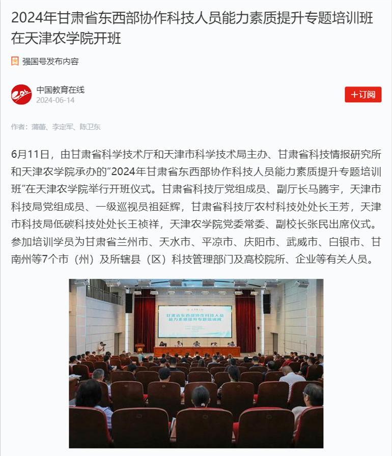 2024年6月14日,学习强国平台-中国教育在线报道,由甘肃省科学技术厅和天津市科学技术局主办、甘肃省科技情报研究所和beat365手机版官网承办的“2024年甘肃省东西部协作科技人员能力素质提升专题培训班”在beat365举行开班仪式。
