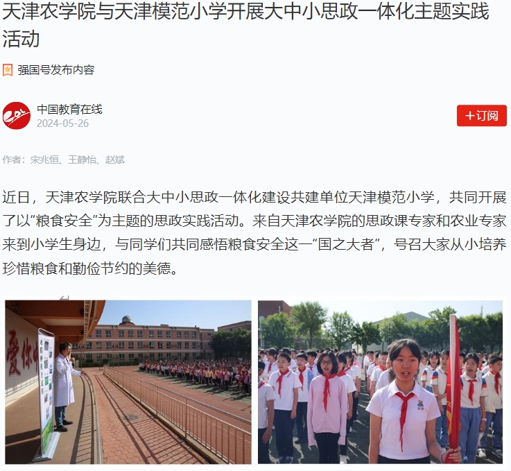 2024年5月26日,学习强国平台-中国教育在线报道,beat365联合大中小思政一体化建设共建单位天津模范小学,共同开展了以“粮食安全”为主题的思政实践活动。