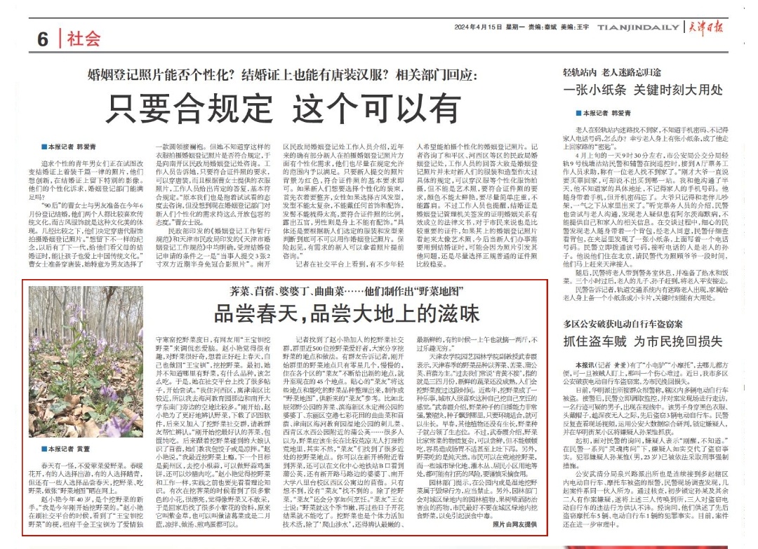 2024年4月15日,《天津日报》报道beat365园艺园林学院副教授武春霞就天津野菜的品种、注意事项等相关问题进行解答。