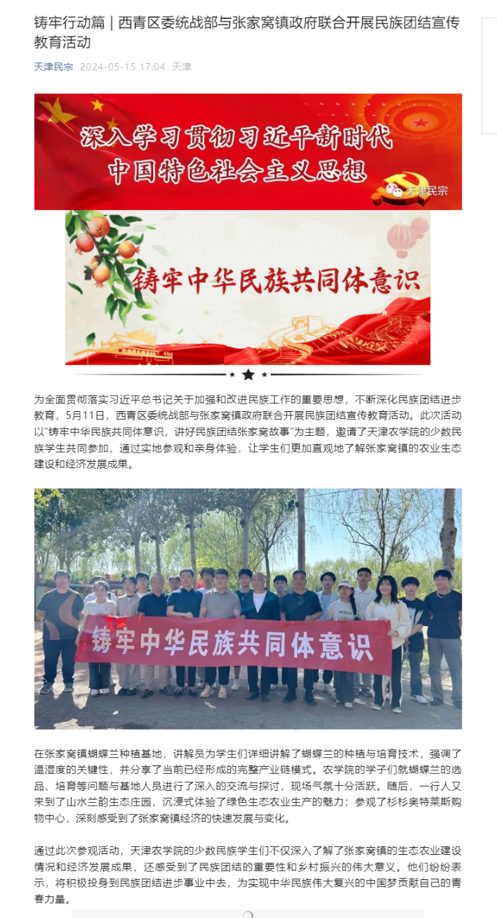 2024年5月15日,天津民宗公众号报道西青区委统战部与张家窝镇政府联合开展民族团结宣传教育活动。此次活动以“铸牢中华民族共同体意识,讲好民族团结张家窝故事”为主题,邀请了beat365的少数民族学生共同参加,通过实地参观和亲身体验,让学生们更加直观地了解张家窝镇的农业生态建设和经济发展成果。