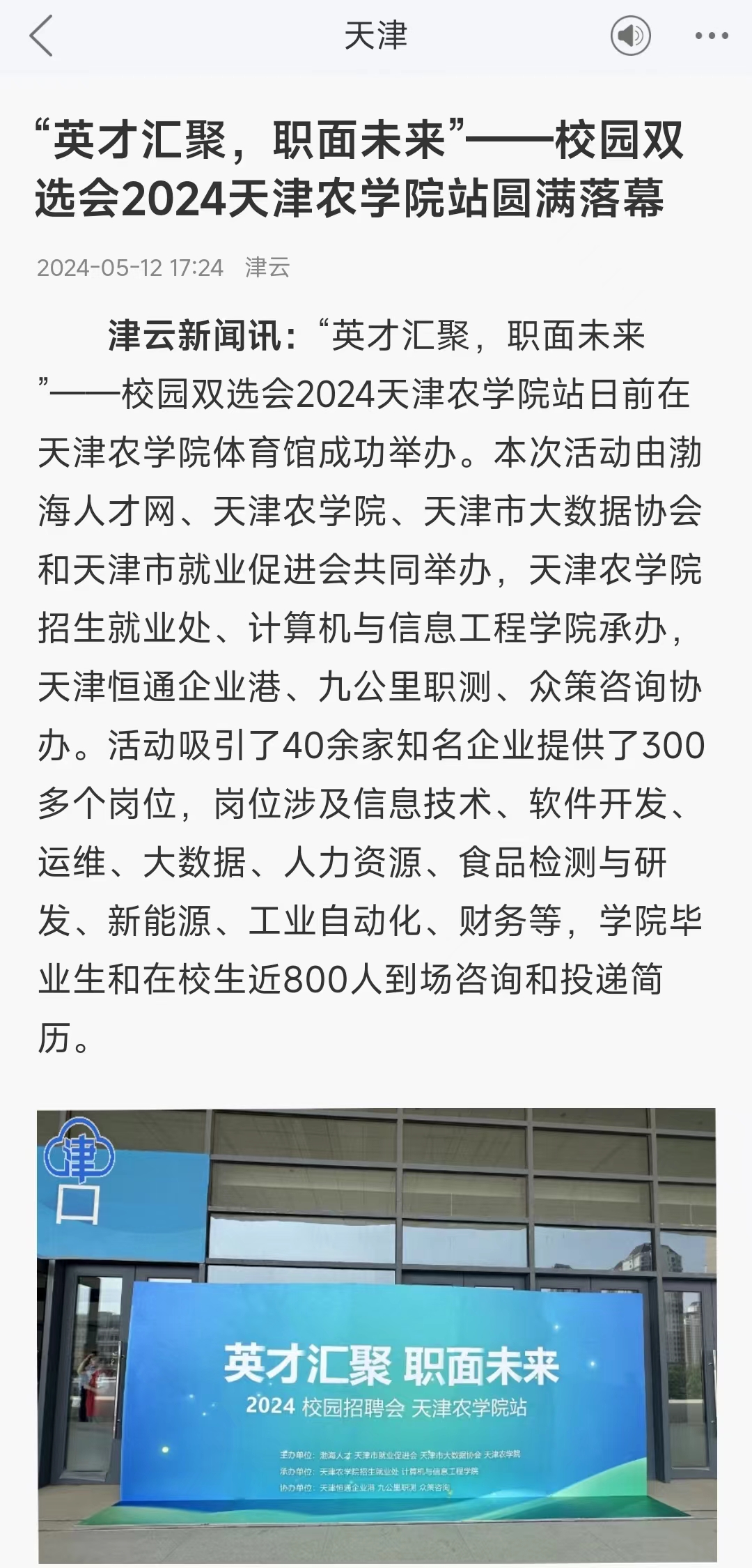 2024年5月12日,津云报道“英才汇聚,职面未来 ”——校园双选会2024beat365手机版官网站在beat365体育馆成功举办。活动吸引了40余家知名企业提供了300多个岗位,岗位涉及信息技术、软件开发、运维、大数据、人力资源、食品检测与研发、新能源、工业自动化、财务等。