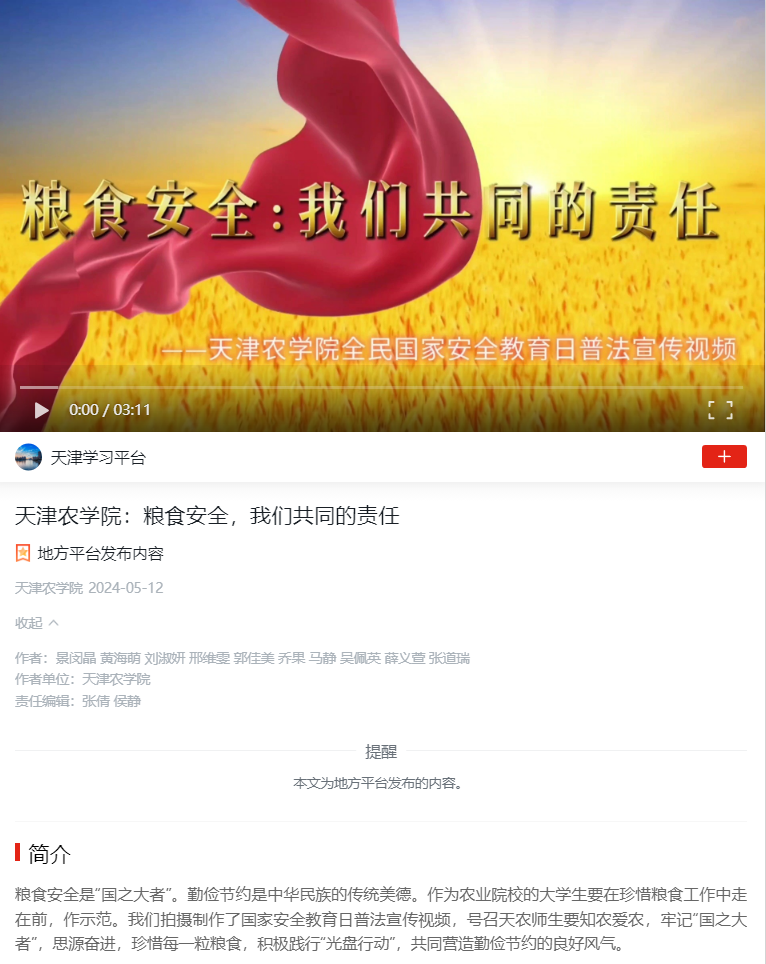 2024年5月12日,学习强国平台-天津学习平台展播beat365拍摄制作的国家安全教育日普法宣传视频。