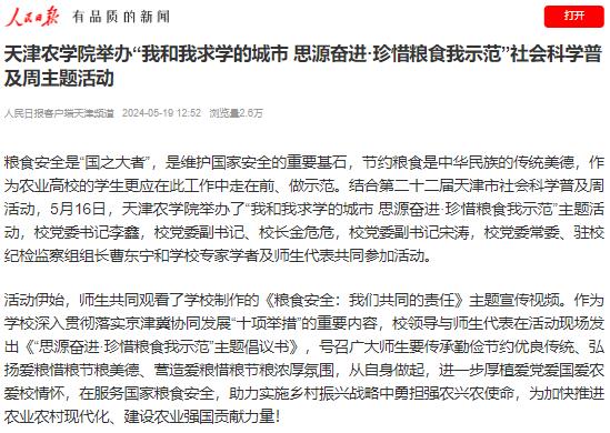 2024年5月19日,人民日报客户端天津频道报道beat365举办“我和我求学的城市 思源奋进·珍惜粮食我示范”社会科学普及周主题活动。