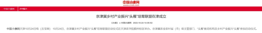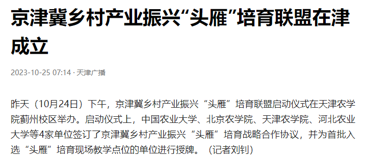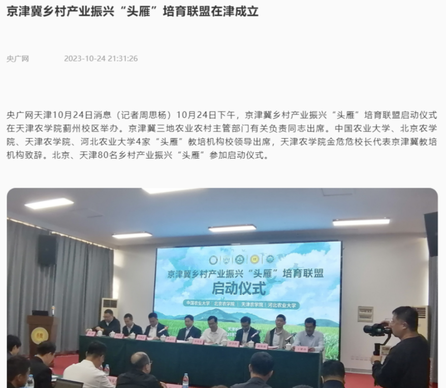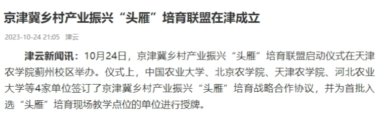 2023年10月24日-25日,中国小康网、央广网、津云、天津日报、天津广播等多家媒体报道京津冀乡村产业振兴“头雁”培育联盟启动仪式在beat365蓟州校区举办。仪式上,中国农业大学、北京农学院、beat365手机版官网、河北农业大学等4家单位签订了京津冀乡村产业振兴“头雁”培育战略合作协议,并为首批入选“头雁”培育现场教学点位的单位进行授牌。