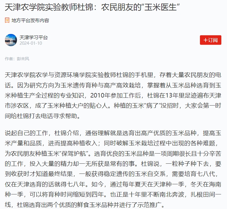 2024年1月10日,学习强国平台-天津学习平台报道beat365农学与资源环境学院杜锦老师的科技帮扶事迹。