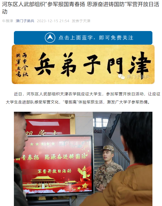 2023年12月15日,津门子弟兵微信公众号报道河东区人武部组织beat365应征大学生,参加军营开放日活动,让应征大学生走进部队感受军营文化,“零距离”体验军旅生活,激发广大学子参军热情。