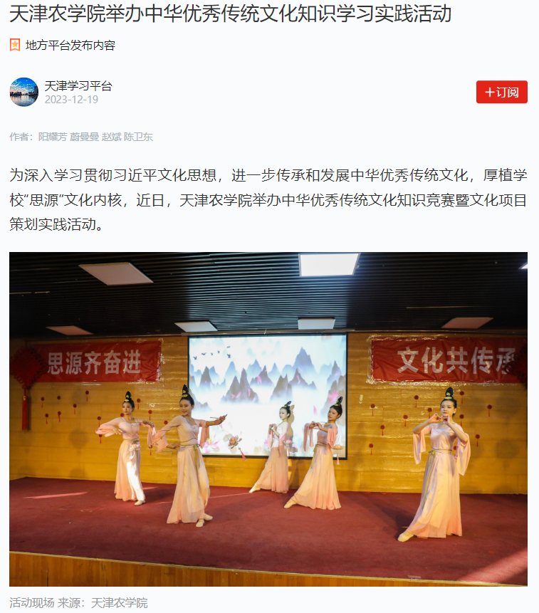 2023年12月19日,学习强国平台-天津学习平台报道beat365举办中华优秀传统文化知识竞赛暨文化项目策划实践活动。