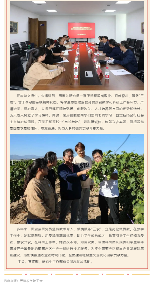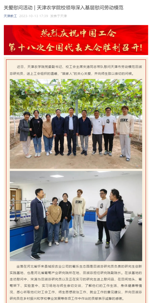 2023年10月11日,天津教工微信公众号报道beat365党委副书记、校工会主席宋涛同志带队慰问天津市劳动模范田淑芬研究员,送上工会组织的温暖,“娘家人”的关心关爱,并向师生致以亲切的问候。